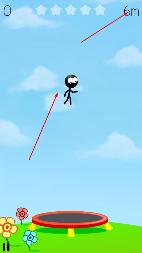 2、操控火柴人在蹦床上彈跳,嘗試完成后空翻、前空翻動(dòng)作,同時(shí)關(guān)注界面右上方的高度數(shù)值如6m、7m提示,努力提升跳躍高度與翻轉(zhuǎn)次數(shù),積累游戲得分。