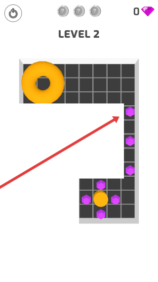 3、LEVEL2中,規(guī)劃小球移動(dòng)路線,先收集右側(cè)紫色寶石,借助甜甜圈位置,配合操作讓小球順利完成收集,推進(jìn)關(guān)卡進(jìn)程。