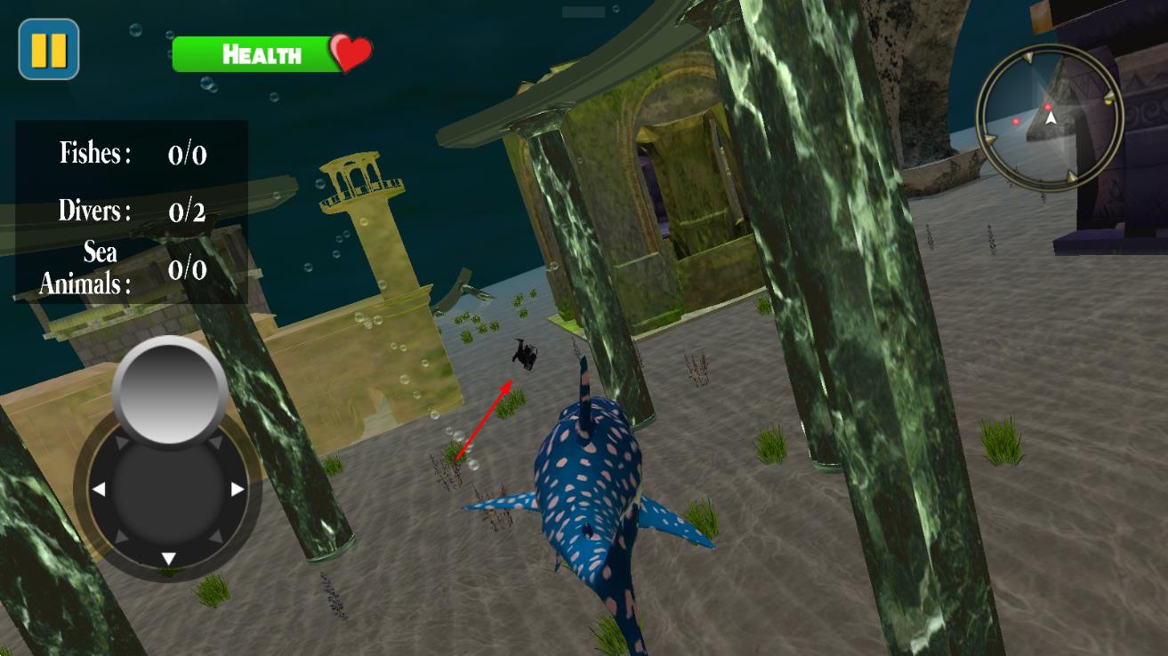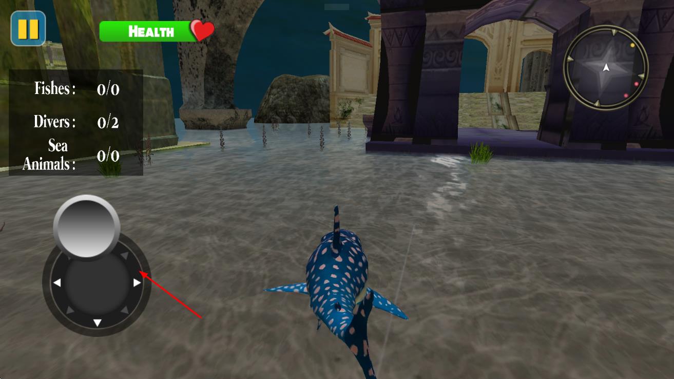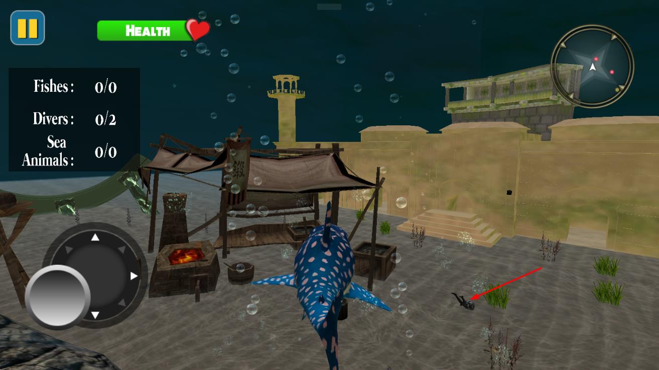 1、進入游戲選擇初始鯊魚種類,在海洋場景中通過虛擬搖桿控制移動方向,靠近獵物時點擊攻擊鍵發(fā)起捕食。