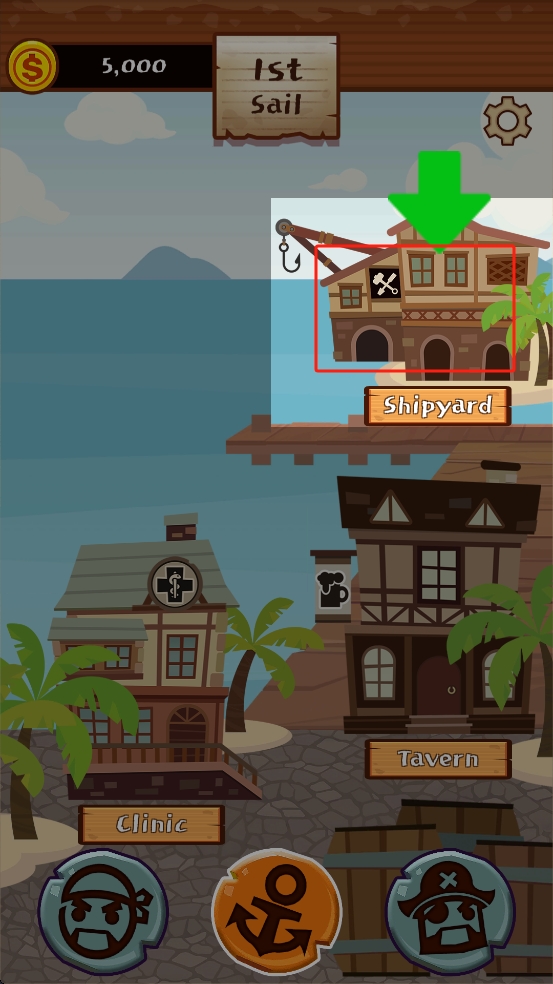 1、在港口場景,跟著綠色箭頭指引,點(diǎn)擊帶有工具圖標(biāo)的造船廠建筑,進(jìn)入造船廠界面,開展船只相關(guān)操作。