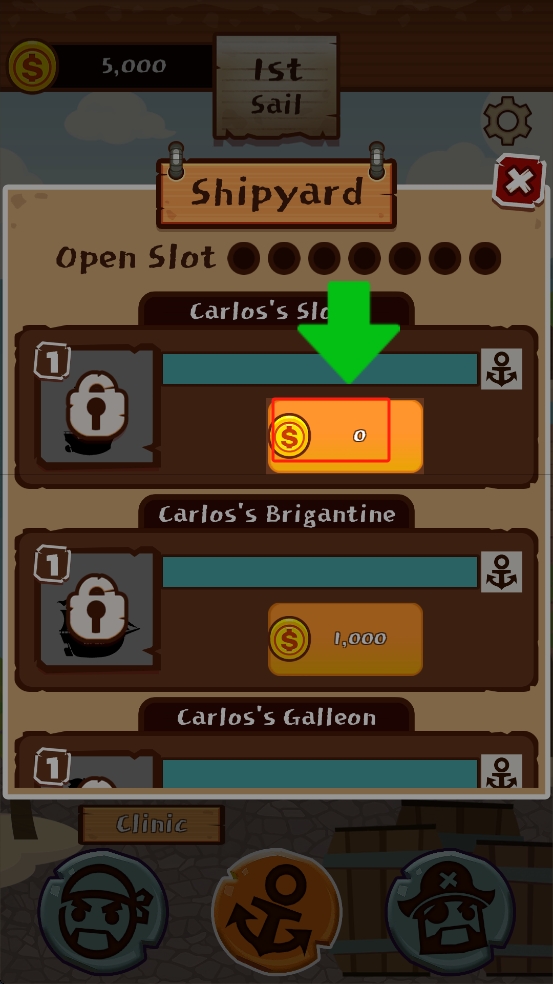 2、進(jìn)入造船廠后,依照綠色箭頭提示,留意對應(yīng)船只建造槽的橙色區(qū)域,通過積累或消耗金幣,解鎖、升級建造槽。
