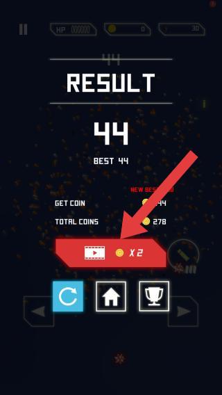 3、顯示目前最高得分為44,獎(jiǎng)勵(lì)金幣278,可觀看視頻獲得雙倍的增益,也可點(diǎn)擊下方的三個(gè)圖標(biāo)。