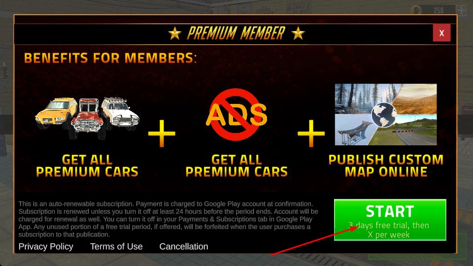 1、點(diǎn)擊START按鈕,可享3天免費(fèi)試用會(huì)員服務(wù),訂閱后獲取全部高級(jí)車輛、免廣告權(quán)益,還能在線發(fā)布自定義地圖,需留意自動(dòng)續(xù)費(fèi)規(guī)則提前24小時(shí)關(guān)閉可終止續(xù)費(fèi)。