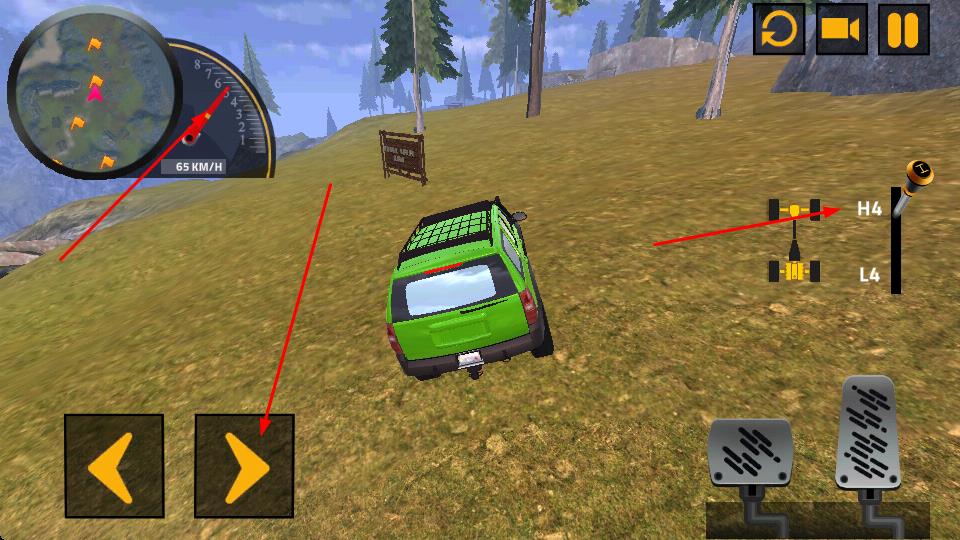 3、駕駛時(shí),通過(guò)方向鍵操控轉(zhuǎn)向,踩油門提升車速,依據(jù)地形切換驅(qū)動(dòng)模式如爬坡選L4、平路用H4,觀察時(shí)速表與地圖,順利完成越野賽道挑戰(zhàn)。