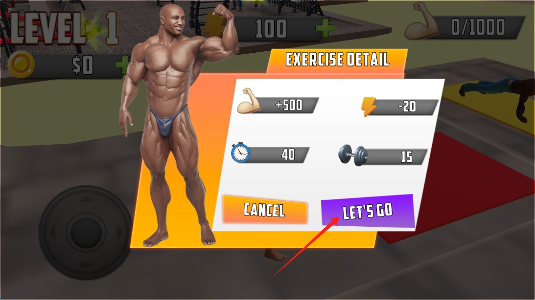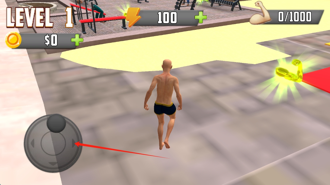 1、關(guān)卡場景,用左側(cè)搖桿操控角色移動,收集健身道具,為訓練做準備,撥動輪盤移動人物。