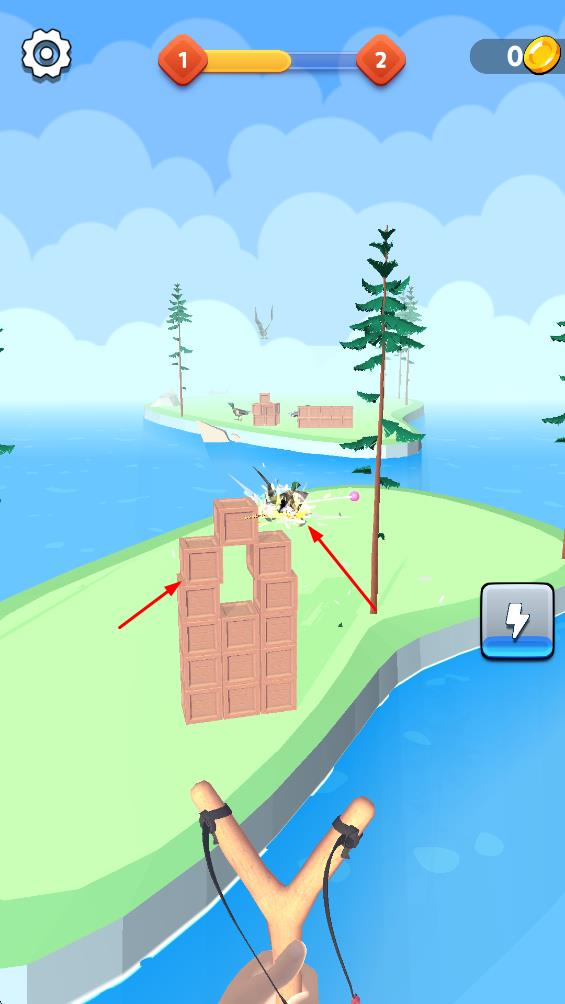 1、拖動彈弓調(diào)整角度,瞄準場景目標如鴨子、建筑,松開手指發(fā)射彈丸,開啟射擊流程。