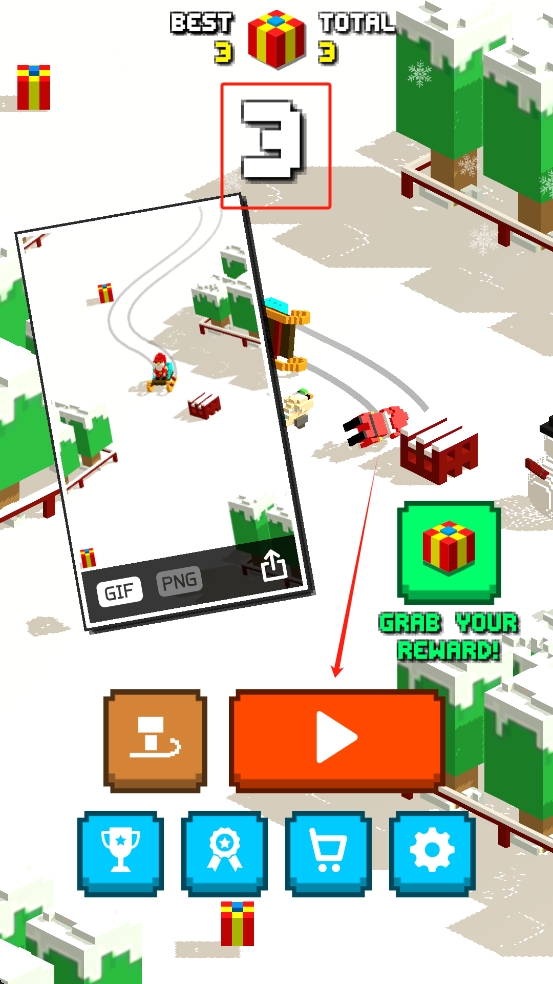 3、成功收集3個(gè)禮盒完成關(guān)卡,點(diǎn)擊橙色播放按鈕可重玩或開(kāi)啟新局,綠色禮盒按鈕可領(lǐng)獎(jiǎng)勵(lì),繼續(xù)挑戰(zhàn)更高難度。