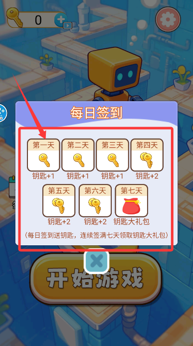 1、登錄游戲后,前往每日福利處領取連續(xù)簽到贈送的鑰匙道具。