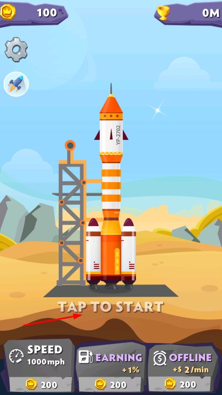 1、初始發(fā)射與飛行啟動:點擊TAP TO START,火箭從地面發(fā)射升空,進入飛行階段,關(guān)注空中出現(xiàn)的互動元素,如數(shù)值標識、點擊區(qū)域,準備操作。