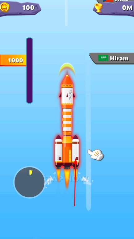 2、飛行互動元素豐富:火箭升空后,空中出現(xiàn)數(shù)值標識、互動區(qū)域,如手指點擊,通過點擊、滑動操作觸發(fā),影響飛行進程與收益獲取。