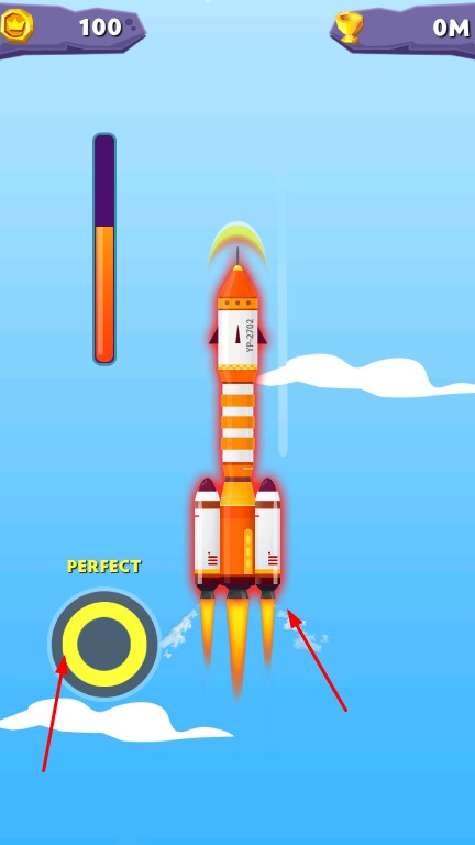 2、飛行操作與收益獲取:飛行中,按提示點擊或滑動互動區(qū)域,觸發(fā)PERFECT判定獲取額外收益,持續(xù)操作維持火箭飛行狀態(tài),盡可能飛更遠距離。