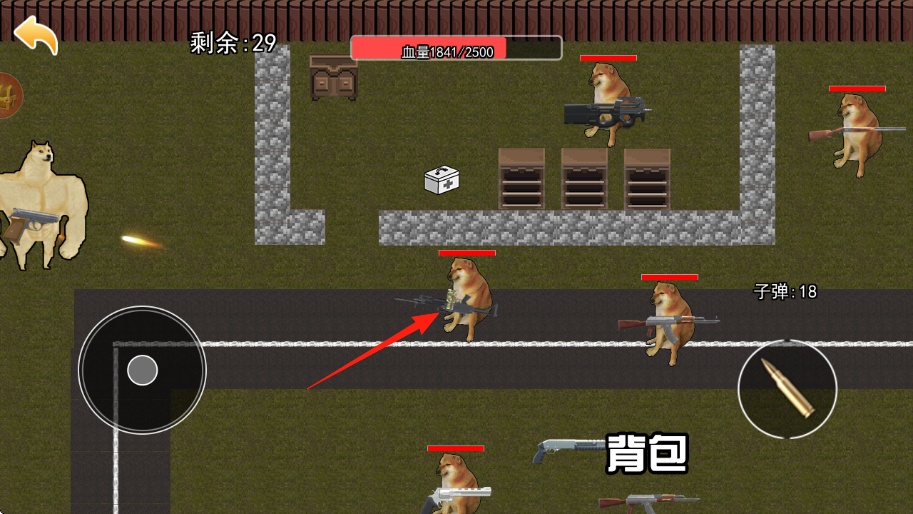 1、操控持槍狗狗,在場景射擊敵人持槍柴犬,留意血量1841/2500、剩余敵人29。