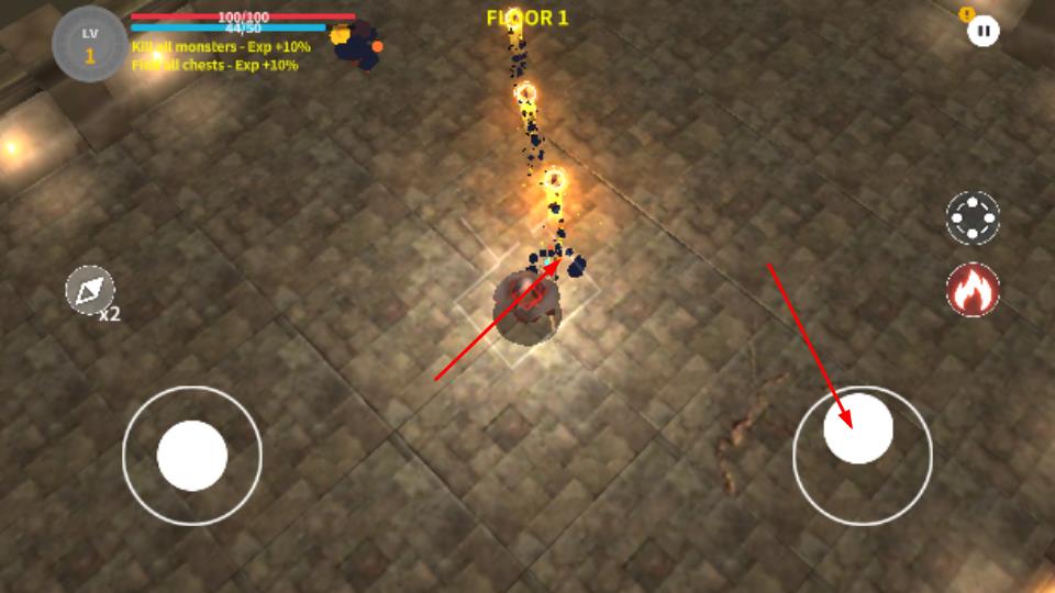 2、戰(zhàn)斗時(shí)左側(cè)搖桿操控角色移動,右側(cè)技能鍵如火焰圖標(biāo)釋放技能,攻擊怪物,收集其掉落物,應(yīng)對地牢場景挑戰(zhàn)。