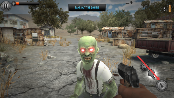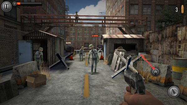 1、瞄準近距離僵尸如第一關(guān)綠色的僵尸,點擊屏幕的射擊按鈕,精準擊中僵尸頭部,快速的消滅目標。