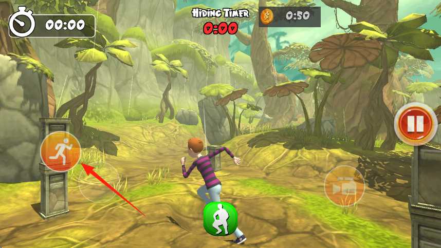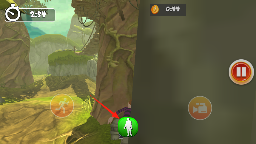 1、點擊左側橙色跑步按鈕,操控角色在叢林奔跑,利用場景躲避,注意上方計時,推進游戲。