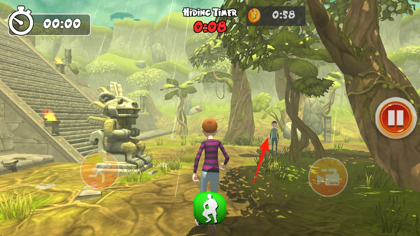 3、靠近樹木時,點擊綠色隱藏按鈕,讓角色藏于場景,利用環(huán)境躲避,關注計時與金幣,達成隱藏目標。