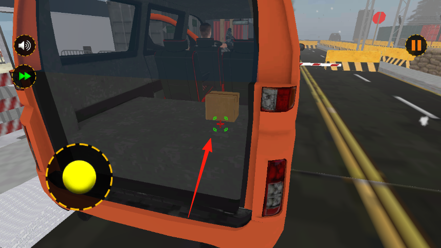 2、進入橙色車內(nèi),瞄準(zhǔn)箱子,按箭頭提示操作,固定貨物,為運輸做準(zhǔn)備,繼續(xù)行程。