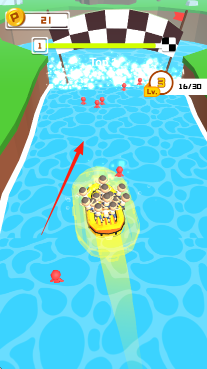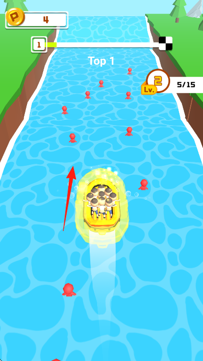 1、操控黃色木筏沿箭頭方向,避紅色章魚,吃金幣,保持Top1,沖向終點,推進關(guān)卡。
