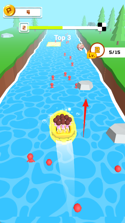 2、木筏行駛中,避石頭等障礙,超對手,保排名,收集金幣,向終點沖刺,完成挑戰(zhàn)。