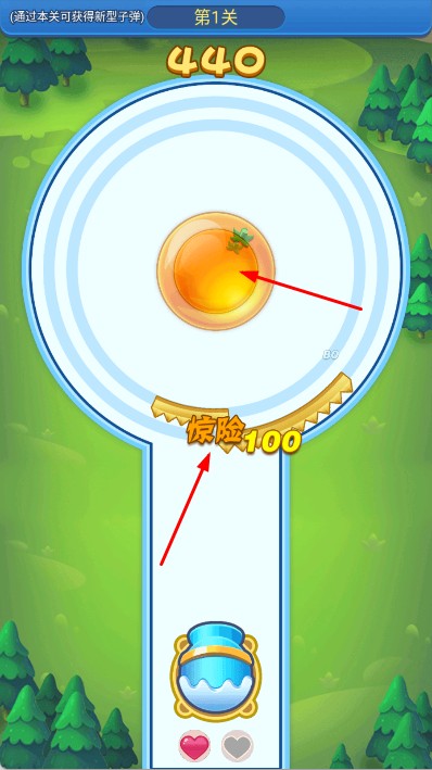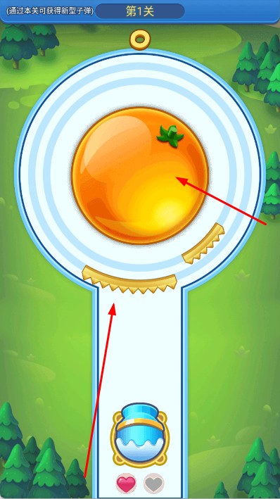 2、在關(guān)卡中,通關(guān)操作控制藍色發(fā)射裝置,發(fā)射彈珠擊打圓形軌道上的水果,利用軌道上的鋸齒等機關(guān),使其體積變小。
