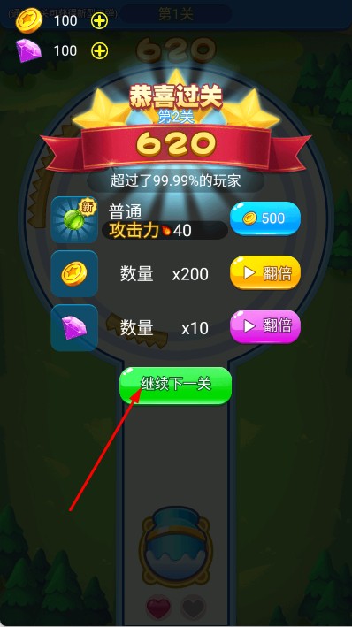 3、持續(xù)擊打水果,當(dāng)水果體積縮小到一定程度,成功通過軌道障礙,完成關(guān)卡目標(biāo),點擊繼續(xù)下一關(guān)。