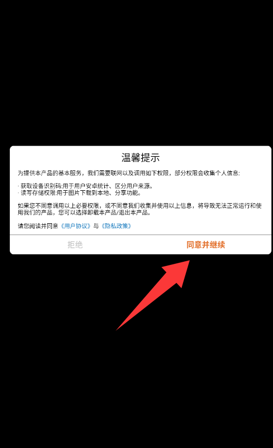1、點(diǎn)擊溫馨提示里的同意并繼續(xù)。