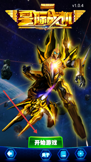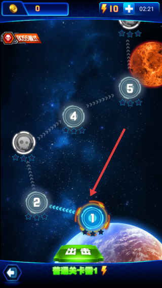 2、在關卡地圖,選定標有1的首關,點擊出擊,駕駛戰(zhàn)機進入戰(zhàn)斗場景,直面宇宙敵人與障礙。