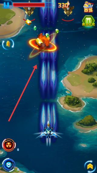 3、戰(zhàn)斗時,操控戰(zhàn)機躲避紫色彈幕,優(yōu)先擊碎帶光環(huán)隕石,收集綠色寶石,利用增益道具清屏,全力摧毀敵機,爭取通關。