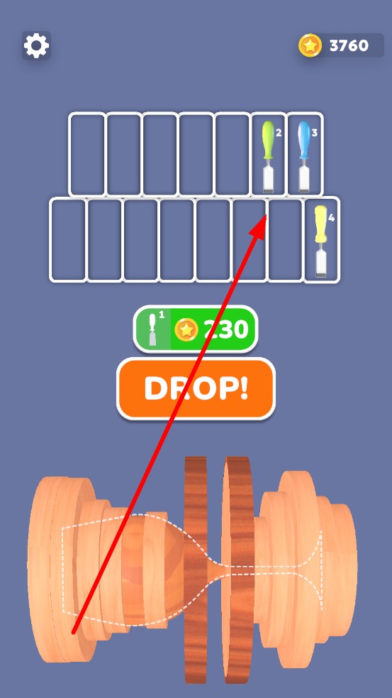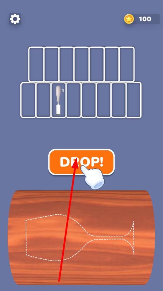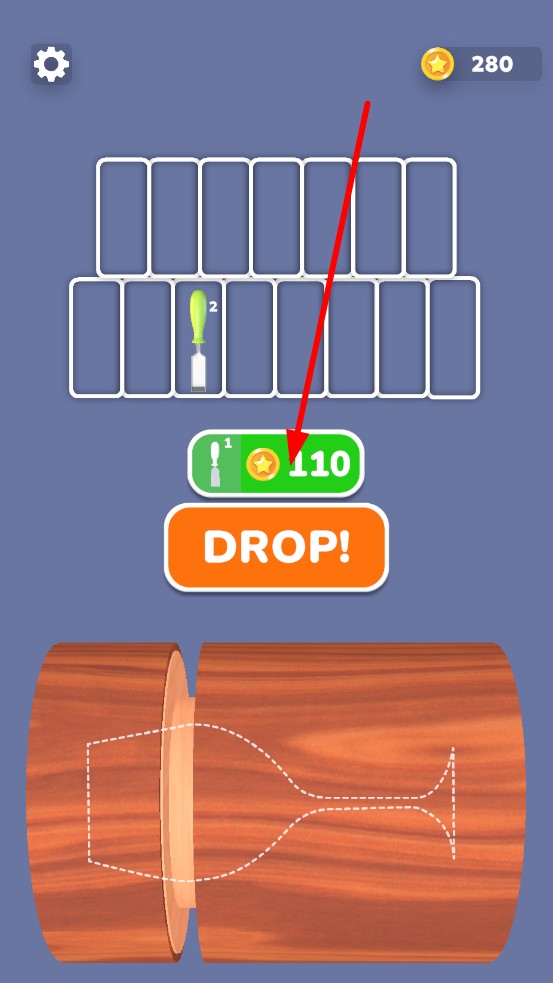 2、點擊DROP按鈕,鋸子帶鋸齒轉動下落,切割處飛濺木屑、顯紋理變化,彈出110金幣提示,需根據(jù)木材形態(tài)變化,判斷適配的工具類型。