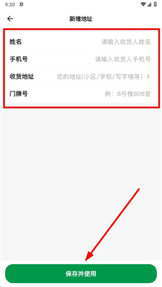 4、在新增地址頁面,依次輸入姓名、手機號、收貨地址、門牌號,然后點擊保存并使用完成添加。