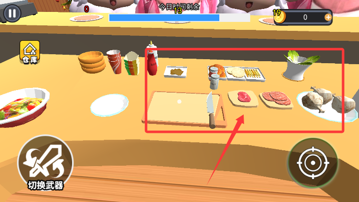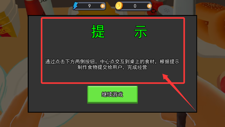 2、閱讀引導(dǎo)說(shuō)明,掌握點(diǎn)擊左右按鍵控制廚房原料的操作方式。