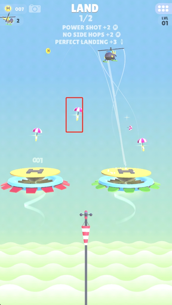 2、飛行過程中,引導(dǎo)直升機(jī)收集帶降落傘的道具,同時注意避開障礙,然后朝著第二個平臺飛行。