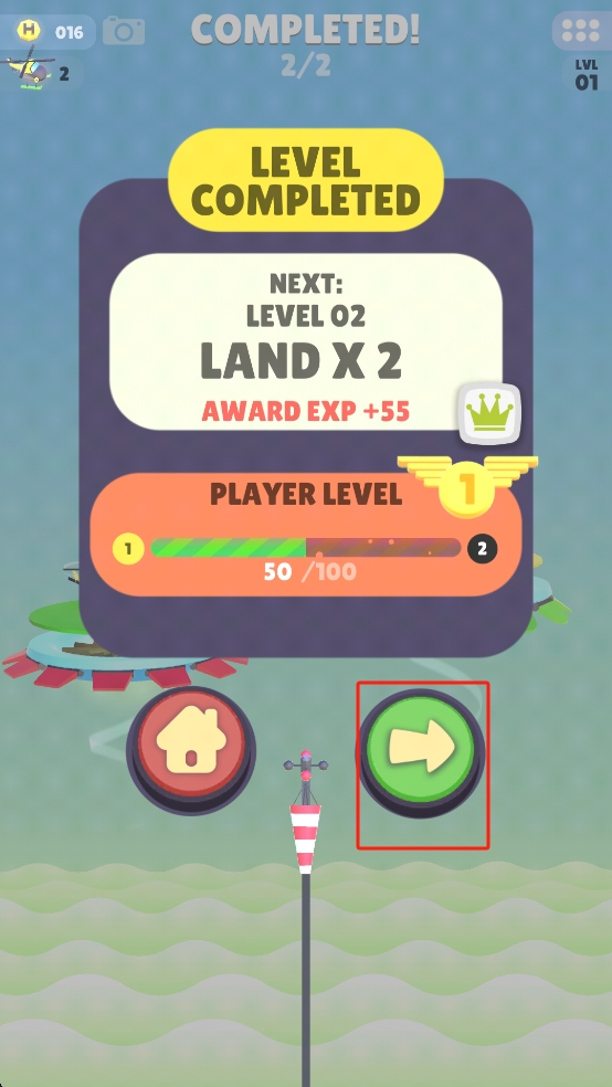 3、成功通關(guān)后,界面會顯示本次飛行的完成度與所用時間,后續(xù)還能解鎖新的直升機(jī)型號,點(diǎn)擊綠色按鈕進(jìn)入下一關(guān)。