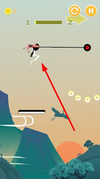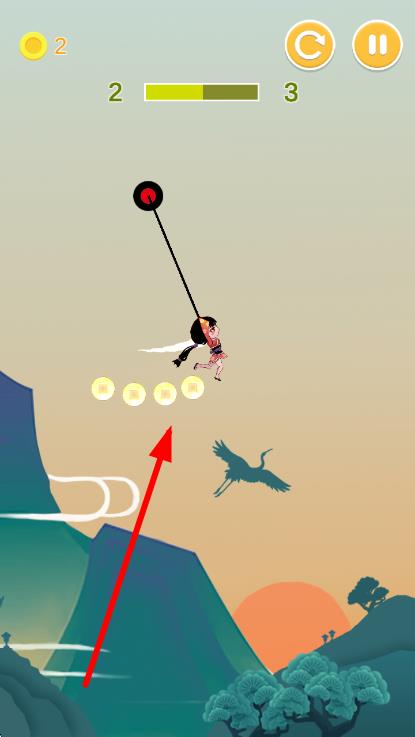 3、在擺動過程中,按箭頭指引方向,調(diào)整繩索落點,收集沿途金幣,持續(xù)向關(guān)卡目標(biāo)前進。