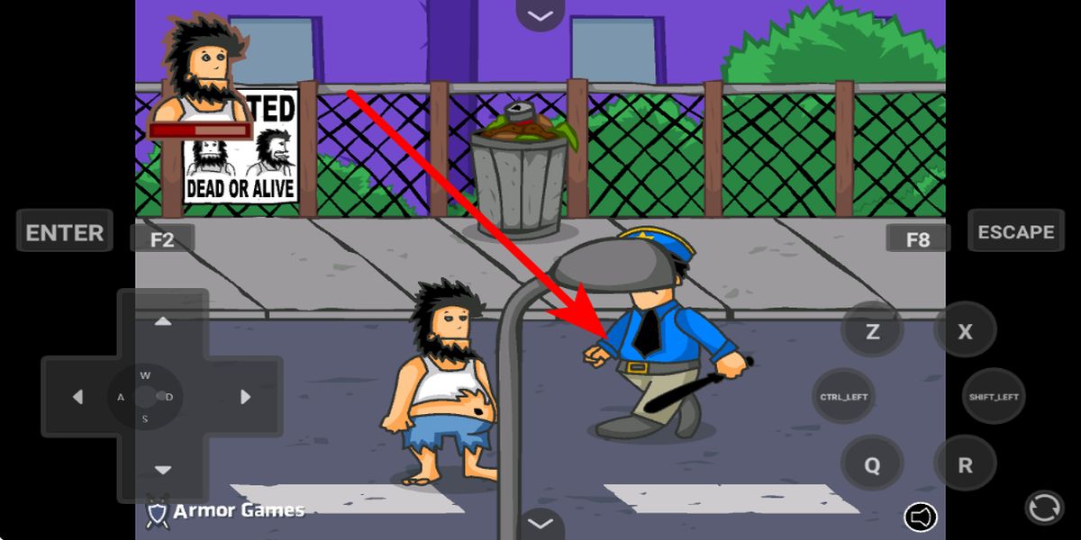 3、遇到警察等敵人,利用按鍵操控角色移動(dòng)攻擊,合理使用拳擊踢擊技能,注意觀察敵人動(dòng)作,借助場(chǎng)景中的垃圾桶等物品,增加戰(zhàn)斗策略。