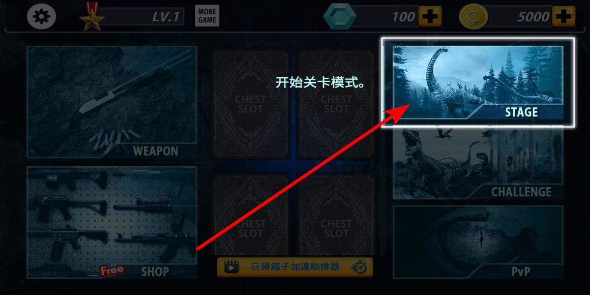 1、進(jìn)入主界面后,在武器寶箱槽等功能區(qū)中,找到右側(cè)標(biāo)有STAGE的關(guān)卡模式入口點(diǎn)擊,快速開(kāi)啟關(guān)卡挑戰(zhàn)流程,逐步推進(jìn)游戲進(jìn)程。