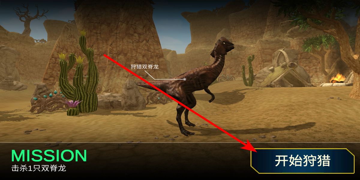 2、確認(rèn)狩獵目標(biāo)為雙脊龍后,查看場(chǎng)景中恐龍狀態(tài)與環(huán)境布局,點(diǎn)擊界面右下角的開(kāi)始狩獵按鈕,順利進(jìn)入戰(zhàn)斗場(chǎng)景執(zhí)行獵殺任務(wù)。