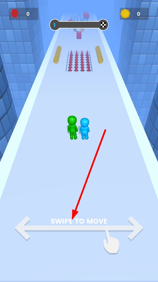 1、滑動屏幕控制雙人同步左右移動,沿通道邊緣收金幣,躲避尖刺,避免單側(cè)偏移觸發(fā)陷阱。