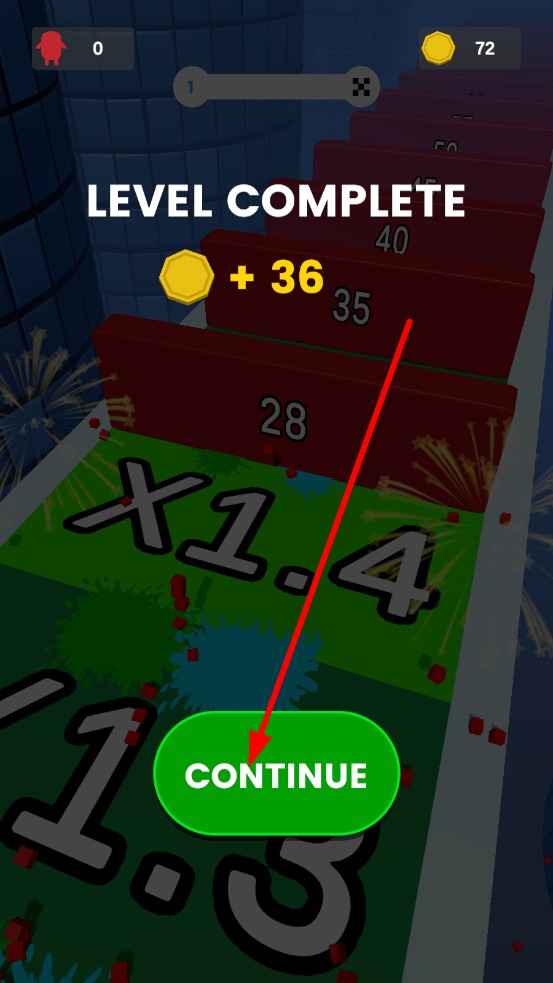 3、紅色小人的數(shù)量決定了結(jié)算的金幣數(shù)量倍數(shù),點擊繼續(xù),開啟下一關(guān),挑戰(zhàn)更加復(fù)雜的關(guān)卡。