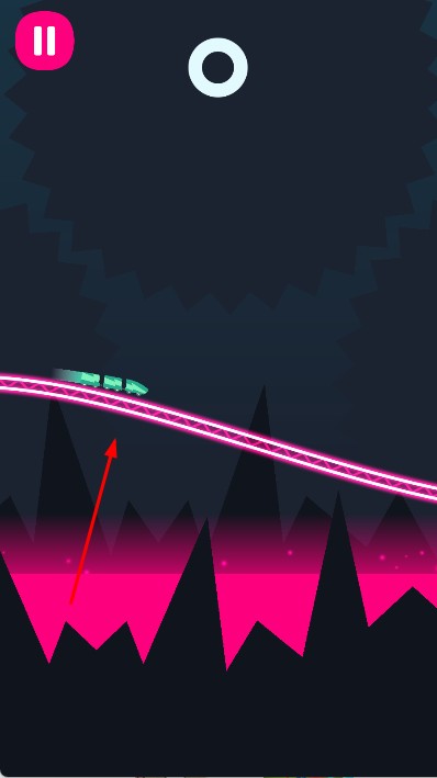 2、在合適時機按住讓過山車著陸,松開手指讓過山車飛起,操控過山車在粉色軌道上行駛。