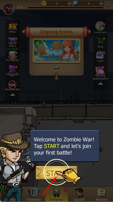 1、進(jìn)入游戲,點(diǎn)擊Tap To Play,開(kāi)啟僵尸防御挑戰(zhàn),在主界面點(diǎn)START,加入首場(chǎng)戰(zhàn)斗。