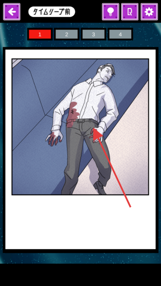 3、進(jìn)入“タイムリープ前”環(huán)節(jié),查看標(biāo)有血跡的人物場(chǎng)景圖,聚焦角色手部等關(guān)鍵位置,分析線(xiàn)索,破解案件謎團(tuán)。