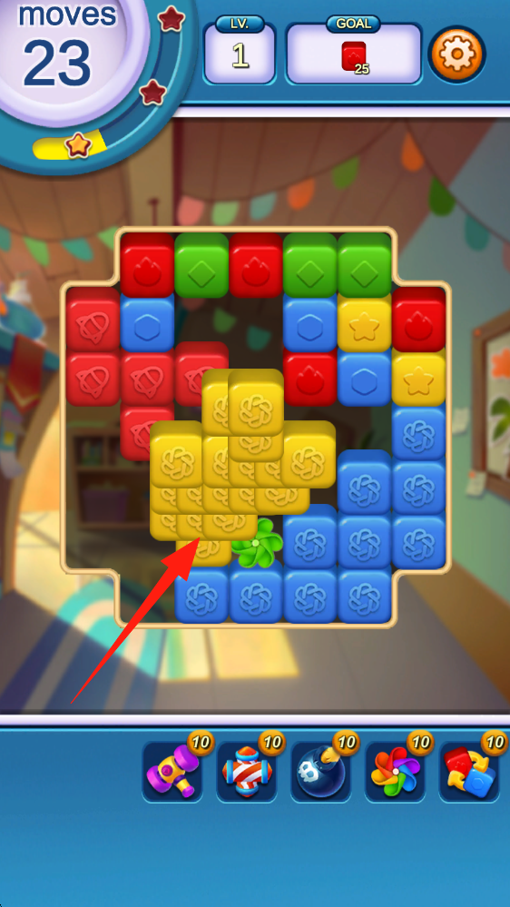 3、消除關(guān)卡中,優(yōu)先處理箭頭指向的黃色方塊,通過消除它觸發(fā)連鎖反應(yīng),助力達(dá)成目標(biāo)。