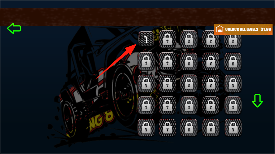 1、點(diǎn)擊屏幕中央的位置按鈕,進(jìn)入游戲,操控綠色拖拉機(jī)開始越野駕駛挑戰(zhàn),點(diǎn)擊選擇關(guān)卡。