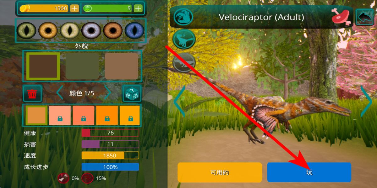 1、進(jìn)入恐龍外觀設(shè)置界面,可挑選眼睛顏色等自定義恐龍外貌,查看健康速度等屬性,確認(rèn)無誤后點(diǎn)擊玩,即可操控所選恐龍進(jìn)入游戲場景。