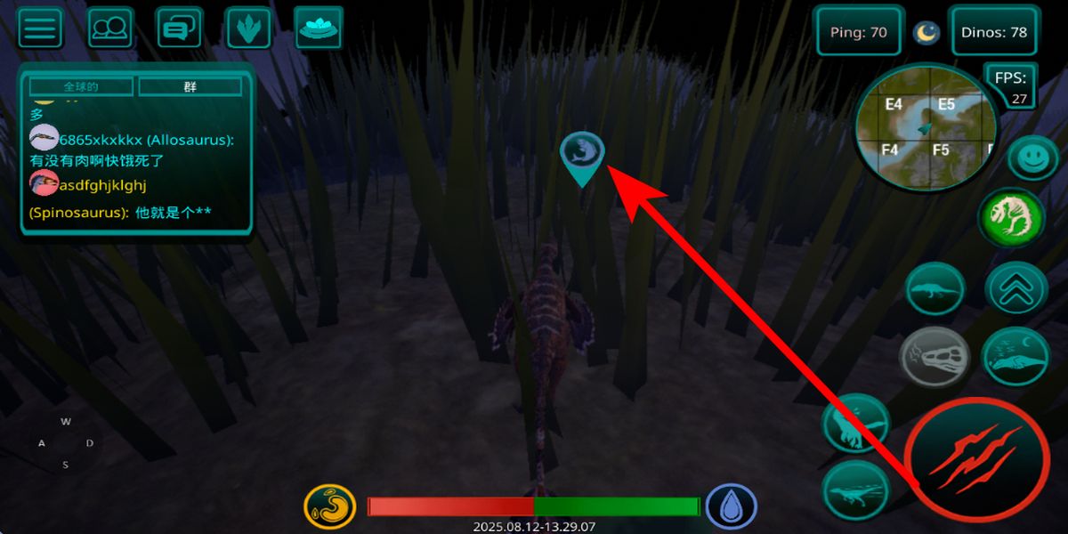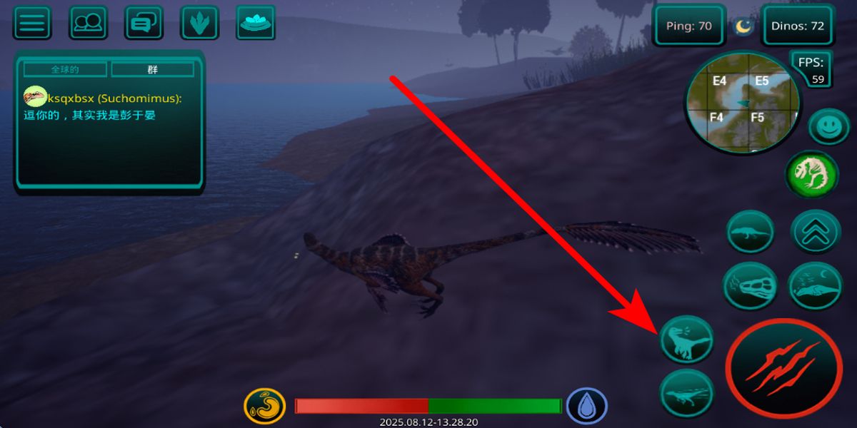 2、在開始后主界面,右側(cè)技能欄有多種動(dòng)作按鈕,點(diǎn)擊對應(yīng)恐龍技能圖標(biāo),能釋放沖刺攻擊等技能,助力在場景中覓食對抗,提升生存與競爭能力。