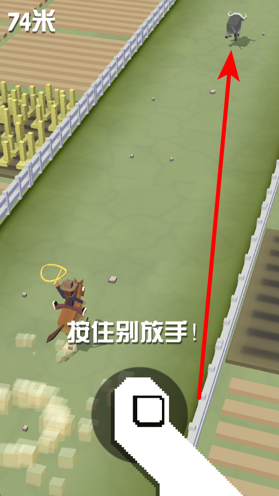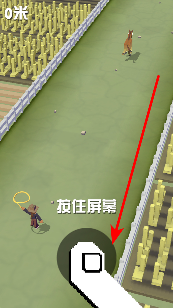 1、開局時看到按住屏幕提示,長按對應(yīng)區(qū)域,讓角色保持準備狀態(tài),這樣才能順利開始騎乘動物的跑酷流程,為后續(xù)套捕動物做準備。
