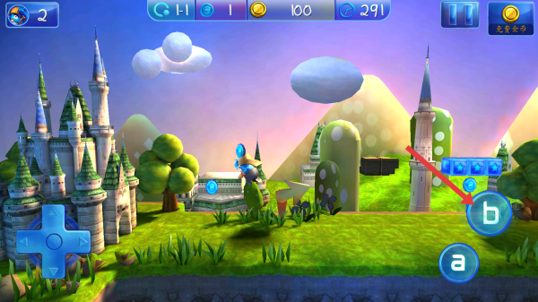 3、在城堡場(chǎng)景中,沿綠色草地推進(jìn),留意空中云朵、遠(yuǎn)處山峰等場(chǎng)景元素,利用角色跳躍能力。
