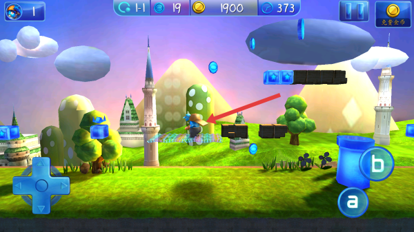 1、進(jìn)入游戲第一關(guān)卡,用左下角十字鍵控制角色移動(dòng),遇到藍(lán)色光環(huán)道具,靠近拾取,積累資源。