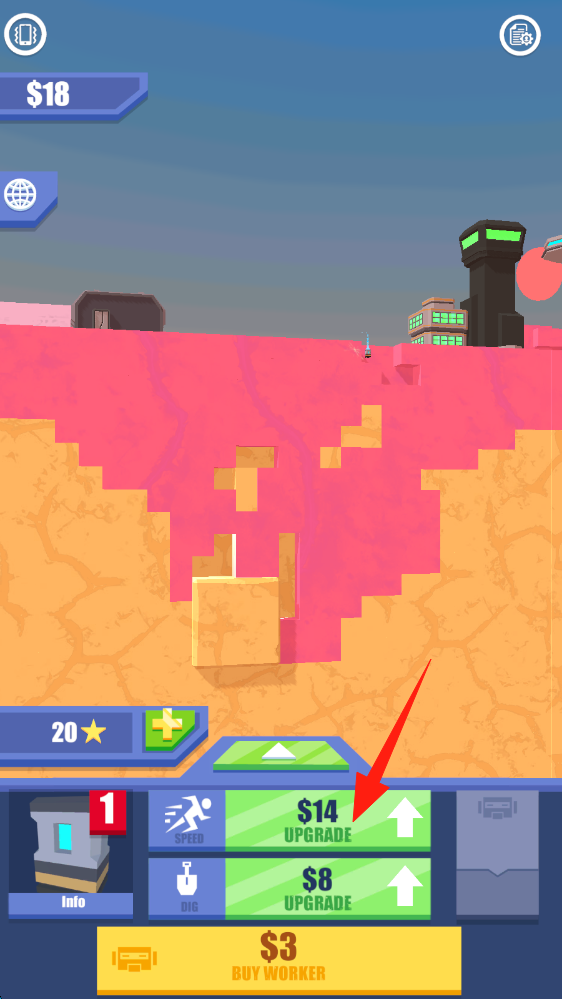 1、花費$14點擊上方綠色Upgrade按鈕,提升挖掘相關(guān)屬性,助力后續(xù)挖掘任務(wù),點擊升級。